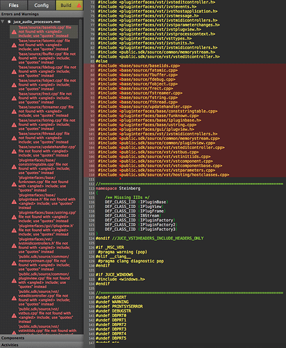 However, now Projucer is complaining about the need to use quotes instead of braces for the includes in juce_audio_processors.mm. But I’m not supposed to change that file, right?