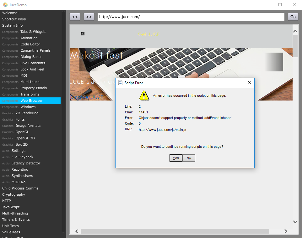 Because you’re visiting a website (juce.com) that doesn’t work with the internal component (IE) anymore. I wouldn’t’ expect ANY company to downgrade the website to 2010 standards so a demo for Juce works.