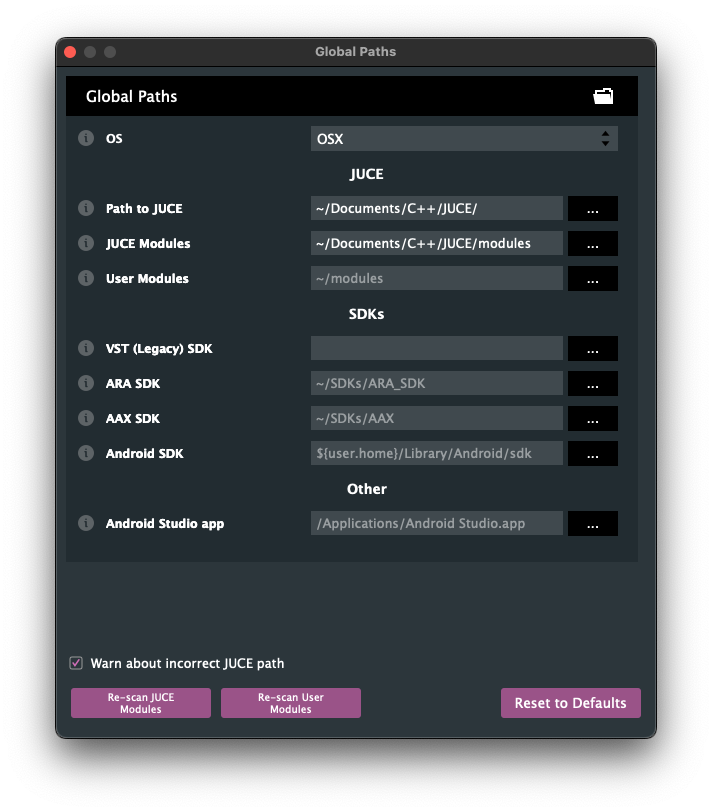 Thanks, that seems to have worked. So I guess on Mac in Projucer you need got to ‘Projucer >> Global Paths’ and set to the entire path of where the ‘Juce’ directory lives on your computer. Using ~/Juce (which was default) or ~/Documents/Juce does not work.