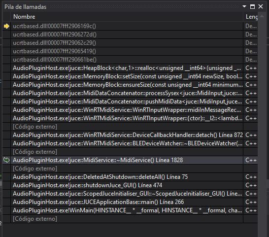 Sorry for my English :). I mean that the crash seems to follow a chain which goes thrue MidiDataConcatenator::pushMidiData and then processSysex. There we have a request for a new size of a MemorBlock on a bad pointer. It is as if it wanted process data on a device already closed. You can see it in the first screenshot I sent.