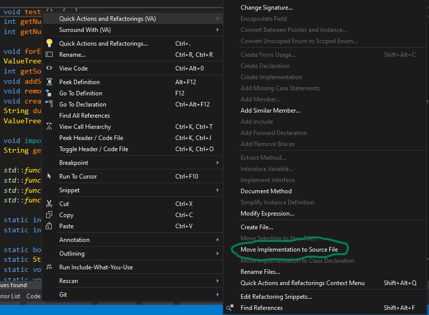 When a user has selected a cpp or header file in the file explorer, there would then be at least one new option;