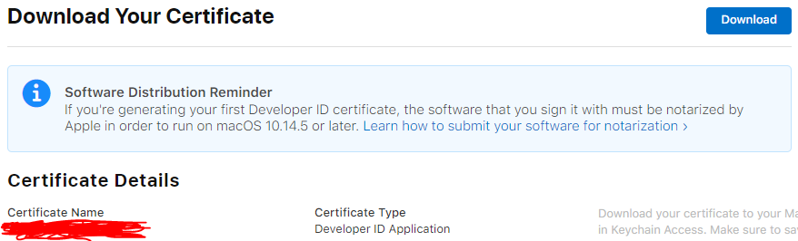 It worked and now I can download my certificate. But, the information alert says I have to notarize my software. This leaves me a bit confused, because I thought I only need to notarize installers but not the VST3. In my case (where I don’t have/want an installer) it remains an open question to me if I have to notarize the VST3 then or not. We’ll find out later I think.
