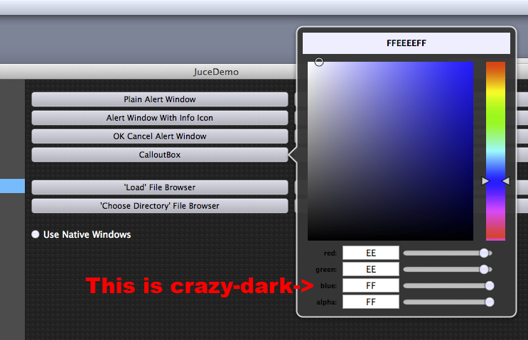 Yes, the CallOutBox does use a dark background color by default. You can change that by overwriting drawCallOutBoxBackground in your own LookAndFeel subclass. I simply copied over the drawing code from the default LookAndFeel and used a different color for drawing the background: