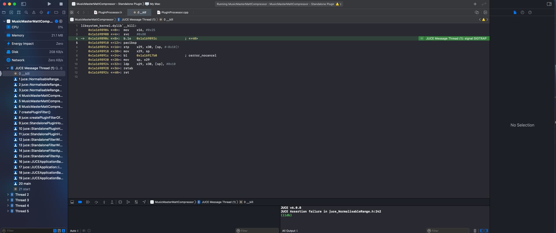 In the output (lower right) it says it stopped because of a jassert was triggered in the juce_NormalisableRange.h line 242.