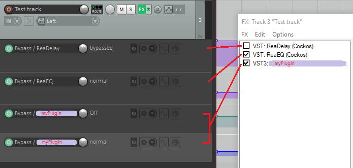 When building it as VST2 and loading it into Reaper, it offers a Bypass parameter which I can also automate, and whose value is reflected in the little checkmark on the track’s FX list (see screenshot). This seems to be a native parameter which Reaper gives to all inserted plugins.