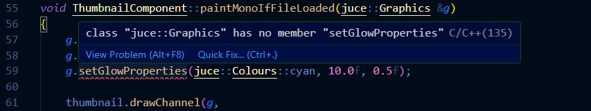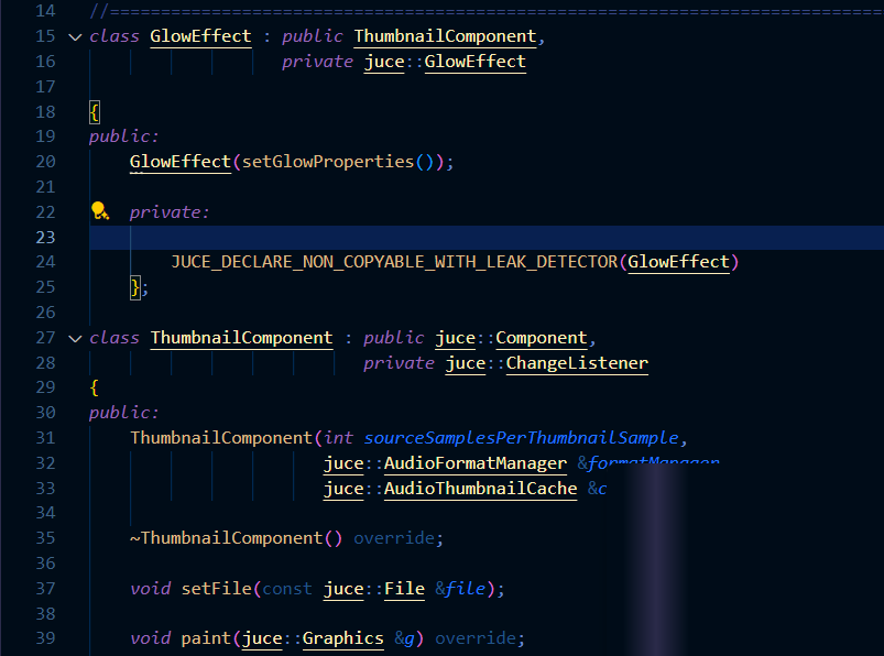 One more tip: you should name your class something other than GlowEffect, because that name is already taken. It will still work most of the time because of the juce:: namespace, but there are some cases where the compiler won’t be able to disambiguate them, and you’ll be left having to make sense of the error messages.